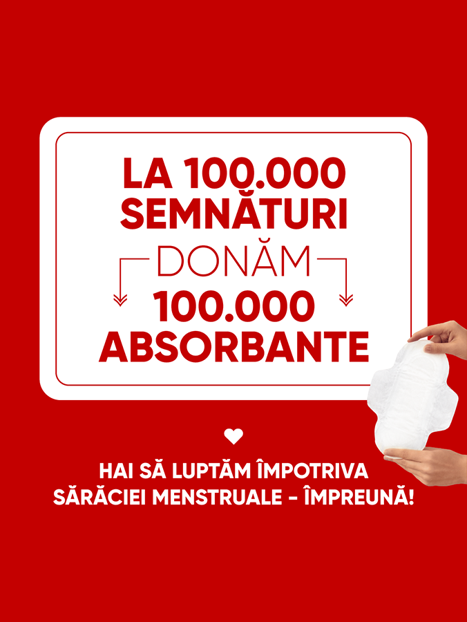 Și încă de la început, ne-am asumat o promisiune: că pentru fiecare semnătură strânsă, vom dona un absorbant. Că 100.000 de semnături, le vom transforma în 100.000 de absorbante donate fetelor și femeilor afectate de sărăcia menstruală. Un mod al nostru de a arăta că ne pasă. Că nu mai întoarcem privirea. Că luptăm ca ceva să se schimbe.